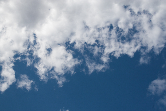 Das Bild zeigt einen blauen Himmel, der mit weißen, flauschigen Wolken bedeckt ist. Die Wolken haben eine interessante Struktur und erzeugen einen schönen Kontrast zum tiefblauen Hintergrund. Das Bild wirkt natürlich und friedlich.
