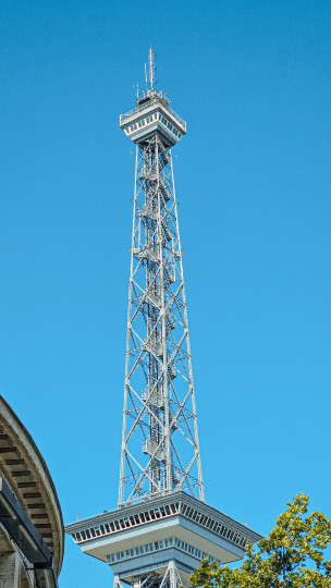 Das Bild zeigt den Fernsehturm in Berlin, ein bekanntes Wahrzeichen der Stadt. Der Turm dominiert die Szene und ragt hoch in den azurblauen Himmel. Die Stahlkonstruktion des Turms ist detailliert dargestellt und zeigt die komplexe Architektur. Im Vordergrund sind einige Bäume und Gebäude zu sehen, die den Turm umgeben. Das Bild ist gut belichtet und die Farben sind kräftig. Die Szene vermittelt ein Gefühl von Modernität und Fortschritt.
