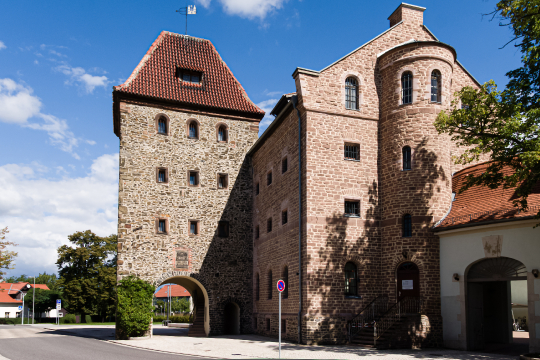 Das Foto zeigt den Stendaler Turm, ein markantes mittelalterliches Stadttor in der Altstadt von Stendal, Sachsen-Anhalt. Der Turm ist aus grauem Stein gebaut und verfügt über eine charakteristische Zinnenkrone und eine Bogenöffnung. Neben dem Turm befindet sich ein Fachwerkhuschen mit einem roten Dach. Die Szene wirkt ruhig und idyllisch, mit einem Hauch von Gemütlichkeit. Der Himmel ist blau mit vereinzelten Wolken, was auf gutes Wetter hindeutet.