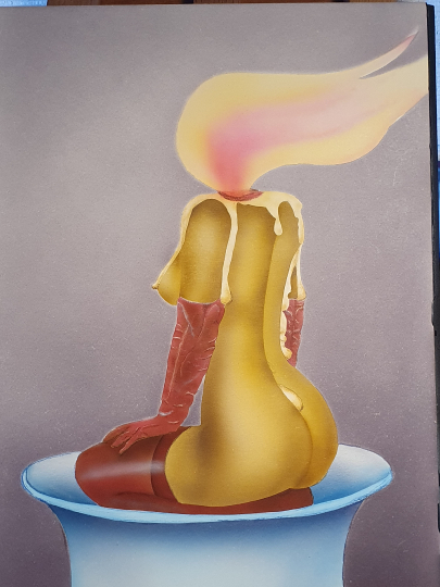 Dieses faszinierende Kunstwerk praesentiert eine skurrile Verschmelzung von Formen und Ideen. Die zentrale Figur, eine weibliche Gestalt, ist auf geniale Weise in die Form einer brennenden Kerze integriert. Ihre Haut schimmert in einem warmen, goldenen Ton, der an Wachs erinnert, während ihre Silhouette eine sinnliche und zugleich fragile Eleganz ausstrahlt. Die roten Stiefel, die ihre Füße zieren, bilden einen auffälligen Kontrast zum warmen Farbton des Körpers und verleihen dem Bild eine unerwartete Note von Lebendigkeit und Stil. Die Figur steht in einem blauen Becher, der als Sockel dient und eine zusaetzliche Ebene der Komposition hinzufuegt. über der Figur schwebt eine zarte Flamme, die das Licht des Werkes bestimmt und eine Atmosphre von Wrme und Vergnglichkeit erzeugt. Die Farbpalette ist zurckhaltend, aber wirkungsvoll, mit einem Fokus auf warme Gelb- und Orangetne, die durch den khlen Blau des Bechers akzentuiert werden. Das Gesamtbild ist ein surrealer Traum, der den Betrachter dazu einldt, ber die Verbindung von Schnheit, Vergnglichkeit und Transformation nachzudenken.