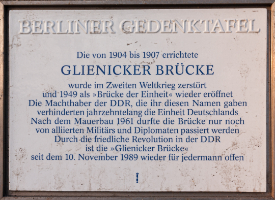 Das Bild zeigt eine Gedenktafel aus Metall mit eingraviertem Text. Die Tafel ist leicht verwittert und weist Gebrauchsspuren auf. Der Text ist in einer serifenlosen Schrift gehalten und beschreibt die Geschichte der Glienicker Brücke.