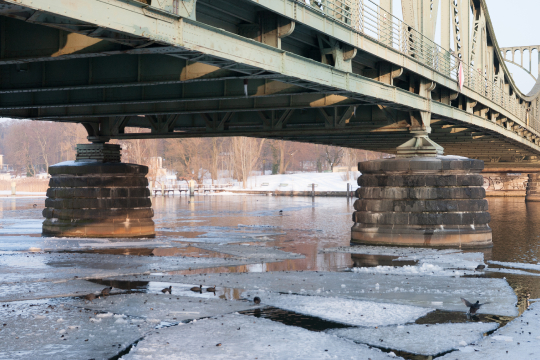 Das Foto zeigt eine Detailaufnahme der Glienicker Brücke in Potsdam, Deutschland. Die Brücke, ein Beispiel für Architektur, spannt sich über einen Fluss, dessen Oberfläche mit Eisplatten bedeckt ist. Die Pfeiler der Brücke sind aus Stein und wirken massiv. Im Hintergrund sind Bäume und Gebäude zu sehen, die auf eine städtische Umgebung hindeuten. Das Eis im Fluss deutet auf kalte Wetterbedingungen hin. Die Szene vermittelt eine ruhige und winterliche Stimmung.