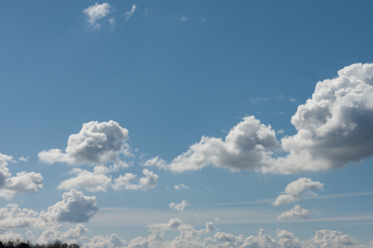 Das Bild zeigt einen weiten Blick auf einen strahlend blauen Himmel, der von zahlreichen, fluffigen weißen Wolken durchzogen ist. Die Wolkenformationen sind vielfältig und erzeugen ein dynamisches Muster am Himmel. Im unteren Bildrand ist eine dunkle Silhouette von Bäumen oder Büschen zu erkennen, die den Horizont bilden. Das Bild vermittelt ein Geüfhl von Weite, Freiheit und Ruhe.
