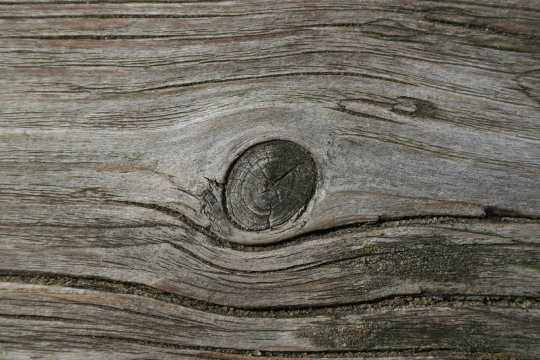 Das Bild zeigt eine detaillierte Nahaufnahme einer Holzoberfläche. Das Holz ist verwittert und weist eine natürliche Textur auf. Ein markantes Auge auch als Auge des Holzes bekannt ist im Zentrum des Bildes zu sehen. Die Farbgebung ist überwiegend in Sepia-Tönen gehalten, was dem Bild einen klassischen und zeitlosen Charakter verleiht. Die Textur des Holzes ist klar erkennbar und dominiert die Komposition.
