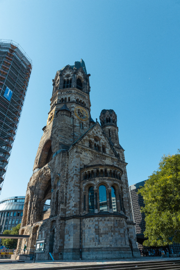 Die Aufnahme zeigt die Kaiser-Wilhelm-Gedächtniskirche in Berlin. Der Turm des Kirchengebäudes dominiert die Szene und ragt in den blauen Himmel. Teile des Gebäudes sind von Gerüsten umgeben, was auf Restaurierungsarbeiten hindeutet. Im Vordergrund sind Fußgänger zu sehen, darunter ein Mann und eine Frau, die die Straße entlanggehen. Im Hintergrund sind moderne Gebäude und Wolkenkratzer erkennbar, die den Kontrast zwischen historischer Architektur und moderner Stadtentwicklung verdeutlichen. Der Himmel ist klar und sonnig, was die Szene in ein warmes Licht taucht. Ein großer Uhrturm ist auf dem Gebäude zu sehen.