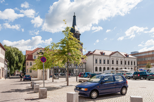 Das Foto zeigt einen belebten Marktplatz in der Altstadt von Haldensleben, Sachsen-Anhalt. Im Vordergrund parkt ein dunkelblaues Auto, und im Hintergrund sind historische Gebäude mit Fachwerkhäusern und einem markanten Turm zu sehen. Der Himmel ist bewölkt, aber sonnig.