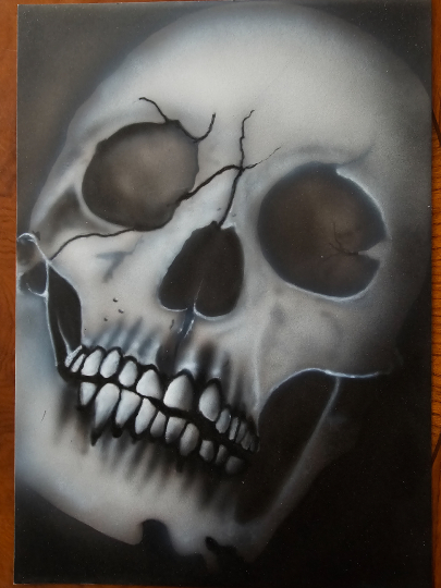 Dieses Airbrush-Kunstwerk fängt die Essenz der Vergänglichkeit ein. Der Schädel, das ultimative Symbol für Sterblichkeit, wird mit meisterhafter Präzision und zarter Sensibilität dargestellt. Die monochrome Farbpalette verstärkt die düstere Atmosphäre und lenkt die Aufmerksamkeit auf die Details der Knochenstruktur. Der feine Riss, der über den Schädel verläuft, ist ein subtiler Hinweis auf die Zerbrechlichkeit des Lebens und die unerbittliche Kraft der Zeit. Die Verwendung der Airbrush-Technik ermöglicht es dem Künstler, weiche Übergänge und feine Schattierungen zu erzeugen, die dem Bild eine beeindruckende Tiefe und Realitätsnähe verleihen. Der dunkle Hintergrund verstärkt den Kontrast und hebt die bleiche Erscheinung des Schädels hervor, wodurch ein eindringlicher und nachdenklich stimmender Eindruck entsteht.