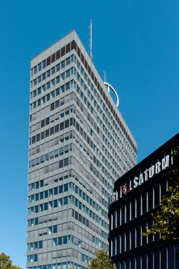 Das Bild zeigt einen modernen Bürokomplex, der sich deutlich von seiner Umgebung abhebt. Das Gebäude ist ein Beispiel für zeitgenössische Architektur und dominiert die Skyline. Das große SATURN-Schild deutet auf einen Elektronikfachmarkt hin, der sich im Gebäude befindet.