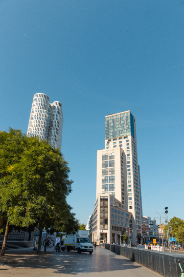 Das Bild zeigt eine lebhafte urbane Szene mit modernen Büro- und Wohntürmen. Der Himmel ist klar und blau, was zu einer hellen und freundlichen Atmosphäre beiträgt. Auf der Straße sind Autos und ein weißer Van zu sehen, und es gibt Fußgänger, obwohl Details nicht erkennbar sind. Ein Zaun verläuft entlang des Gehwegs, und Bäume säumen die Straße. Die Gebäude haben unterschiedliche architektonische Stile, darunter Glasfassaden und weiße Putzflächen. Auf einigen Gebäuden sind Schilder angebracht, die auf lokale Unternehmen oder Hotels hindeuten.