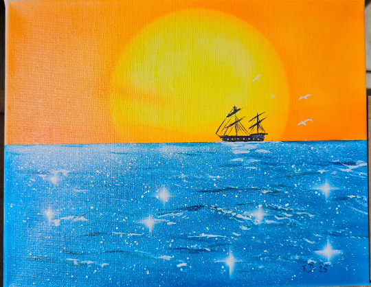 Dieses faszinierende Gemälde fängt die Magie eines ruhigen Sonnenuntergangs auf hoher See ein. Ein klassisches Segelschiff, elegant und stolz, gleitet über das tiefblaue Wasser, das von unzähligen Glitzern der untergehenden Sonne erhellt wird. Die Farbpalette dominiert in warmen Orange- und Gelbtönen, die den Himmel in ein leuchtendes Schauspiel verwandeln. Die sanften Wellen des Meeres spiegeln das Licht wider und erzeugen einen schimmernden Effekt, der das Auge in seinen Bann zieht. Drei anmutige Möwen begleiten das Schiff auf seiner Reise, was der Szene eine zusätzliche Note von Freiheit und Weite verleiht. Die Textur des Leinwand sorgt für eine interessante Oberfläche, die dem Bild eine zusätzliche Dimension verleiht. Die Komposition ist harmonisch und beruhigend, ein Fest für die Sinne.