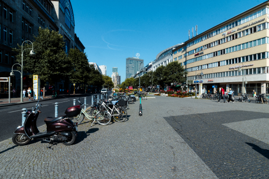 Das Foto zeigt eine belebte Stadtstraße an einem sonnigen Tag. Im Vordergrund sind Fahrradständer mit Fahrrädern und ein Roller (wahrscheinlich Piaggio) zu sehen. Im Hintergrund befinden sich Apartmentgebäude, Geschäftsgebäude und ein Wolkenkratzer. Mehrere Fußgänger sind unterwegs, und in der Ferne sind Autos zu sehen. Die Straße ist mit Pflastersteinen belegt und gesäumt von Bäumen und Blumenbeeten. Die Stimmung ist fröhlich und urban.