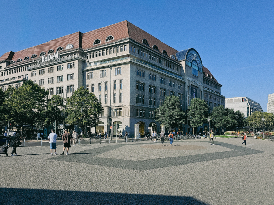 Das Foto zeigt eine belebte Szene in einer Stadt. Im Mittelpunkt steht ein imposantes Gebäude mit einer detaillierten Fassade und zahlreichen Fenstern. Vor dem Gebäude befindet sich ein breiter Bürgersteig, auf dem viele Menschen spazieren gehen oder sich aufhalten. Bäume säumen den Bürgersteig und sorgen für etwas Grün im urbanen Umfeld. Der Himmel ist blau und sonnig, was die lebhafte Atmosphäre der Szene unterstreicht.