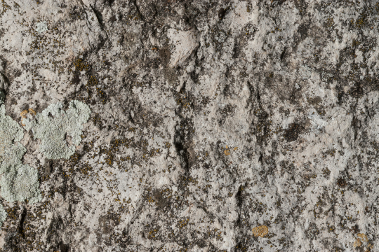 Das Bild zeigt eine detaillierte Nahaufnahme einer Steintextur. Der Stein ist grau und hell, mit vielen Poren und einer unregelmäßigen Oberfläche. Auf dem Stein wachsen Flechten in verschiedenen Farben, darunter Weiß, Grau und Gelb. Die Textur ist stilvoll und wirkt natürlich.