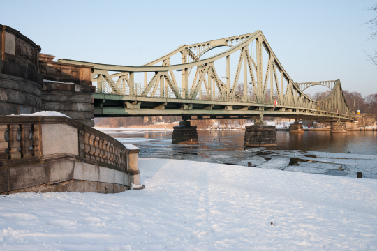Das Foto zeigt die Glienicker Brücke in Potsdam, Deutschland, im Winter. Die Brücke ist eine Eisenkonstruktion und überquert einen gefrorenen Fluss. Der Himmel ist blau und die Sonne scheint. Es liegt Schnee auf dem Boden und auf den Brückenpfeilern. Im Vordergrund befindet sich eine neoklassizistische Mauer mit Balustrade.