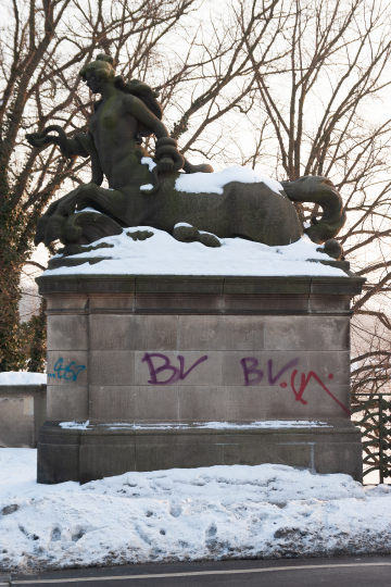 Das Bild zeigt eine bronzene Statue eines Reiters auf einem Pferd. Die Statue steht auf einem Sockel, der mit Schnee bedeckt ist. Im Hintergrund sind Bäume und ein Gebäude zu sehen. Das Bild wurde wahrscheinlich im Winter aufgenommen, da Schnee auf dem Boden und auf der Statue zu sehen ist.