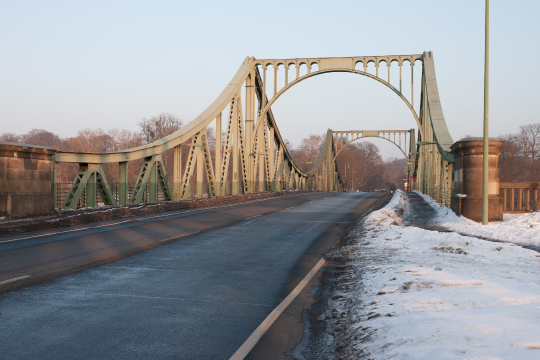 Das Bild zeigt eine imposante Stahlbogenbrücke, die einen Fluss überspannt. Die Brücke ist in einem hellen Grünton gehalten und weist eine markante Architektur mit mehreren Bögen auf. Der Fahrbahnbelag ist dunkel und glatt, und am Strassenrand liegt Schnee. Im Hintergrund erstreckt sich eine verschneite Landschaft mit Bäumen und Büschen. Der Himmel ist klar und blau, was eine ruhige und friedliche Atmosphäre schafft.