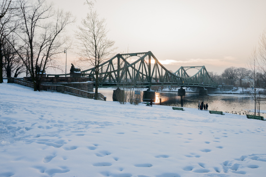 Das Foto zeigt eine verschneite Winterlandschaft mit einer markanten grünen Brücke im Hintergrund. Der Fluss fliesst ruhig unter der Brücke hindurch. Im Vordergrund ist ein verschneiter Park zu sehen, der von Fussabdrücken im Schnee durchzogen ist. Einige Bäume und Büsche säumen den Parkrand. Am Ufer des Flusses stehen einige Personen und Enten.