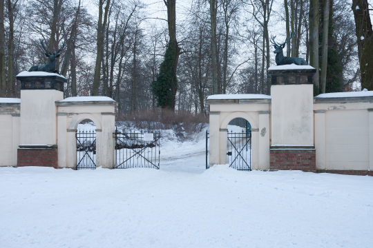 Das Foto zeigt einen verschneiten Wintertag in Potsdam, Deutschland. Im Vordergrund stehen zwei weisse, neoklassizistische Pfeiler mit steinernen Hirschfiguren auf den Köpfen, die einen Durchgang markieren. Zwischen den Pfeilern befinden sich zwei schmiedeeiserne Gittertore, die ebenfalls mit Schnee bedeckt sind. Der Hintergrund besteht aus einem verschneiten Wald mit kahlen Bäumen. Der Schnee liegt dick auf dem Boden und den Ästen der Bäume. Die Szene vermittelt eine ruhige und friedliche Winterstimmung.