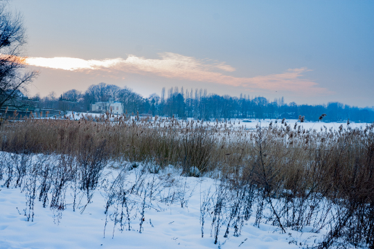 Das Bild zeigt eine Winterlandschaft in Deutschland. Der Vordergrund wird von Schnee und hohem, trockenem Gras dominiert. Im Hintergrund erstreckt sich ein See oder Fluss, dessen Ufer ebenfalls mit Schnee bedeckt ist. Am Horizont sind Bäume und Gebäude erkennbar, darunter möglicherweise die Glienicker Brücke und Potsdam.