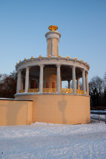 Das Bild zeigt eine klassizistische Rotunde, vermutlich ein Pavillon, in einer verschneiten Winterlandschaft. Die Rotunde ist hell gestrichen und verfügt über eine zentrale Säule mit einer goldenen Kuppel. Um die Säule herum befinden sich Säulen, die einen offenen Umgang bilden. Der Boden der Rotunde ist ebenfalls mit Schnee bedeckt. Im Hintergrund ist ein dichter Baumwipfel zu sehen, der ebenfalls mit Schnee bedeckt ist. Der Himmel ist hellblau und deutet auf einen klaren Wintertag hin.